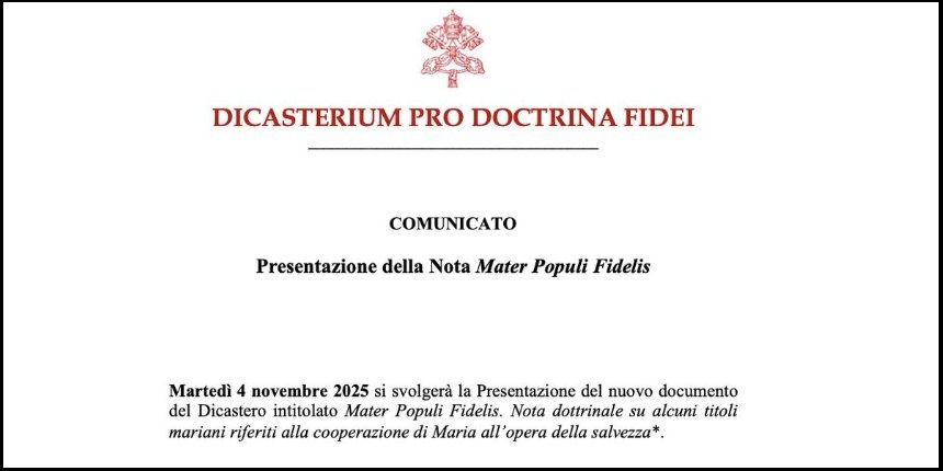++ The Dicastery for the Doctrine of the Faith will publish the document Mater Populi Fidelis. Doctrinal Note on Certain Marian Titles Referring to Mary’s Cooperation in the Work of Salvation. ++ pic.twitter.com/I4X9h6ltR2