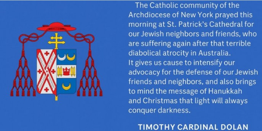 Kard. Dolan: Wir haben „heute Morgen in der Kathedrale St. Patrick für unsere jüdischen Nachbarn und Freunde gebetet, die nach jener schrecklichen, teuflischen Gräueltat in Australien erneut leiden“