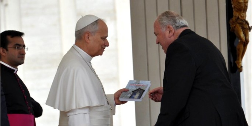 Foto: Pater Dietrich von Stockhausen überreicht Papst Leo XIV. die aktuelle Studie über Heroldsbach © Fabekovec