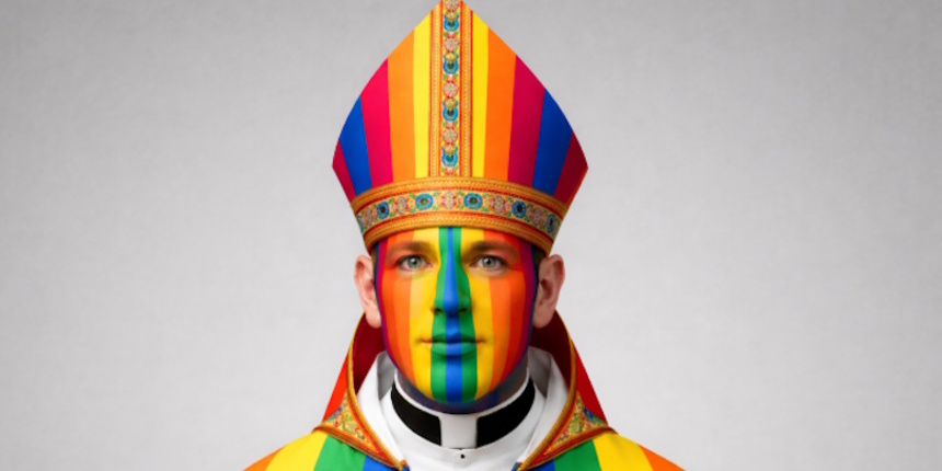 Bild oben: Wenn ein Bischof so ganz hinter der Regenbogenagenda verschwindet, ist er kaum noch als Bischof zu identifizieren. Foto: Peter Winnemöller mit AI.