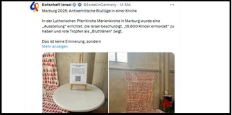 | ![]() Botschaft Israel: „Ein Gotteshaus in Deutschland darf nicht für Blutlügen missbraucht werden“vor 4 Tagen in Deutschland, 7 Lesermeinungen Die israelische Botschaft in Berlin kritisiert Ausstellung in Lutherischer Pfarrkirche in Marburg: „Das ist keine Erinnerung, sondern die Wiederbelebung der uralten antisemitischen Blutlüge, die über Jahrhunderte Pogrome und Verfolgung ausgelöst hat" | ![]() Schluss mit Honeymoon!vor 4 Tagen in Deutschland, 9 Lesermeinungen Die mehrheitlich linken deutschen Bischöfe gehen schrittweise immer mehr auf Konfrontation zu Papst Leo. Jetzt hat der Mainzer Bischof Kohlgraf nach dem Papst-Interview davor gewarnt, das Thema Missbrauch kleinzureden. | @kathtube | ![]() ![]() ![]() ![]() ![]() ![]() Top-15meist-gelesen