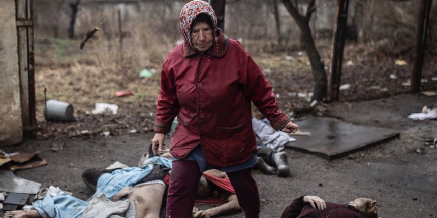Foto: (c) Visegrád 24, eine ältere Frau aus Butscha sucht auf der Straße mit toten Menschen nach ihren Verwandten