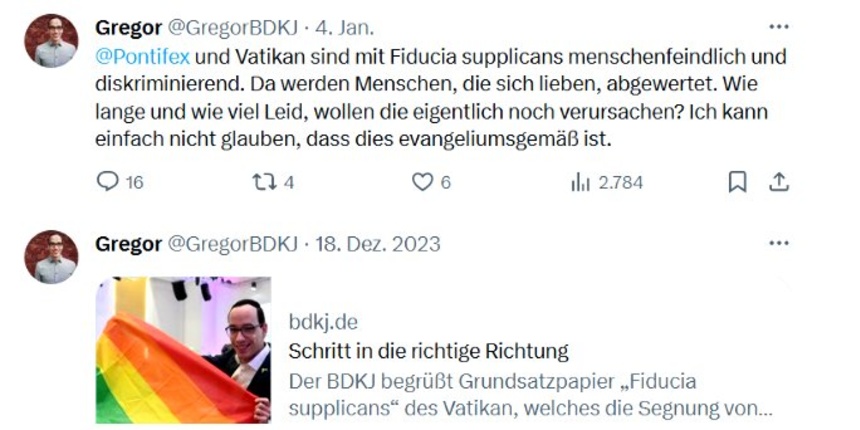 Bonn (kath.net) Unfassbare Kritik äußert der Vorsitzende des Bundes der Deutschen Katholischen Jugend (BDKJ), Gregor Podschun, am Papst. Wörtlich schreibt er auf seinem TwitterX-Account „GregorBDKJ“: „Pontifex und Vatikan sind mit Fiducia supplicans menschenfeindlich und diskriminierend. Da werden Menschen, die sich lieben, abgewertet. Wie lange und wie viel Leid, wollen die eigentlich noch verursachen? Ich kann einfach nicht glauben, dass dies evangeliumsgemäß ist.“ Sein Post steht in spürbarer Spannung zur ersten Reaktion des BDKJ auf „Fiducia supplicans“.