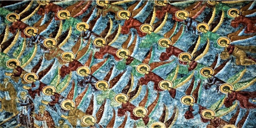 1) Die Alte Kirche in Ost und West: Die frühen Fresken, Mosaiken, Tafelbilder/ Ikonen wollen in der Alten Kirche nicht unter dem Aspekt von „Kunst“ verstanden werden. Sie sind sinnfällige Zeichen einer „Vergegenwärtigung“ für das, was sie abbilden: Sie sind Erscheinung des himmlischen Urbildes. Das gilt nicht nur von Christus, sondern auch von den Engeln und Heiligen, die Anteil haben an seiner überirdischen Seinsweise. In der Ikonographie der Alten Kirche und der Ostkirchen nehmen die Engel einen breiten Raum ein. Sie sind Boten Gottes, Repräsentanten der Herrlichkeit Gottes, Diener des Pantokrators, Beschützer, Begleiter und Geleiter der Menschen und Völker. Der Engel lebt ganz aus dem Wesen Gottes, und seine Verehrung kann nur Ehrung des Schöpfers sein. Die Darstellung der Engel, die auch ein Real-Symbol der Nähe Gottes ist, verwendete z.B. im byzantinische Farbkanon Purpur als Verweis auf die Göttlichkeit, Blau auf die Kreatürlichkeit oder die angenommene Menschheit bei Christus, Gold ist Zeichen der Zeitlosigkeit des Himmels, der Ewigkeit, und Weiß der Widerschein der Heiligkeit. Wie Liturgie und Väterpredigt, so ist auch das Kultbild der Alten Kirche den Gläubigen Belehrung und legt Zeugnis für die Glaubenswahrheiten ab. Es steht im Dienst der Vergegenwärtigung, der Verkündigung und Bekundung des Glaubens der Kirche.