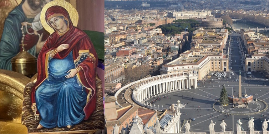 Die Krippe wird in der Adventszeit ein Bild der schwangeren Maria zeigen. Ab dem 25. Dezember wird Maria in anbetender Haltung vor dem Jesuskind in der Krippe zu sehen sein.