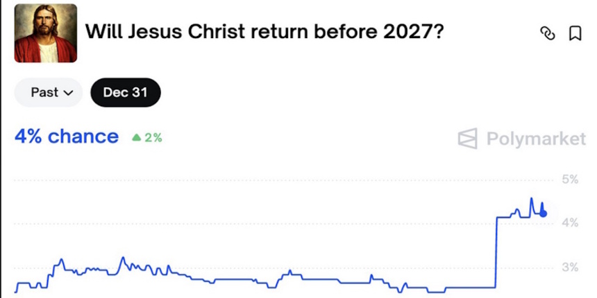 Auf der dezentralen Prognoseplattform „Polymarket“ haben sich die Wetten auf eine Rückkehr Jesu Christi im Jahr 2026 über Nacht verdoppelt
