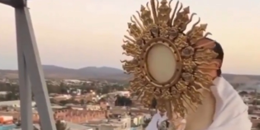 Wenige Minuten später stieg P. Pedro Martínez Navarro mit einer Monstranz mit dem Allerheiligsten Sakrament auf das Dach. Gemeinsam sangen die beiden Priester das Lied „You Shall Reign“ und spendeten den vier Himmelsrichtungen den Segen, wobei sie die gesamte Region dem Herrn anvertrauten.